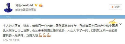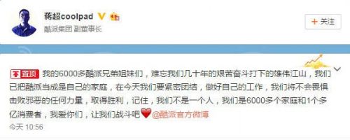 隨后,酷派集團副董事長蔣超今日通過微博表態(tài),號召員工緊密團結(jié),做好自己的工作,不會畏懼擊敗邪惡的任何力量,取得勝利。(明宇)