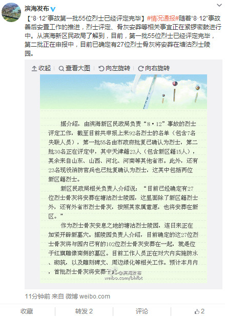 中新網(wǎng)9月9日電 據(jù)天津市濱海新區(qū)政府官方微博“濱海發(fā)布”消息,隨著“8·12”事故善后安置工作的推進(jìn),烈士評定、骨灰安葬等相關(guān)事宜正在緊鑼密鼓進(jìn)行中。從濱海新區(qū)民政局了解到,目前,第一批55位烈士已經(jīng)評定完畢,第二批正在申報中,目前已確定有27位烈士骨灰將安葬在塘沽烈士陵園。