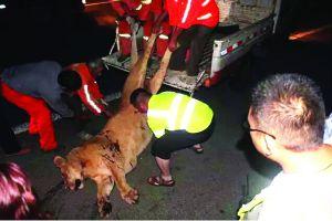 9月7日22時許,一輛河南籍大貨車行駛在蚌寧高速公路上,駕駛員周師傅正準備到前方2公里左右的嘉山服務區休息一下。突然,高速公路行車道上躥出一個黑影,“嘭”的一聲,跟車頭撞了一下。周師傅急剎車后停了下來,就在他準備下車時,發現這個黑影站了起來,在車燈的照亮下,周師傅嚇了一大跳,竟然是頭獅子!獅子左腿可能被撞傷了,但仍一瘸一拐地朝前走。驚出一身冷汗的周師傅不敢下車了,趕緊拿起手機向高速路政報警。