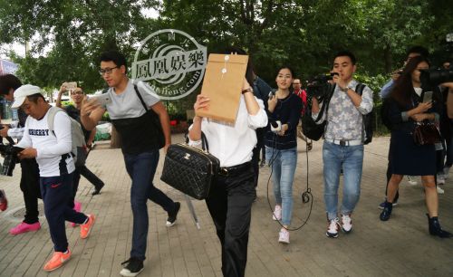 郭美美同案男子趙曉來的辯護律師劉娓娜現身后快步走進法院,并用文件遮住臉部,未接受媒體的采訪。