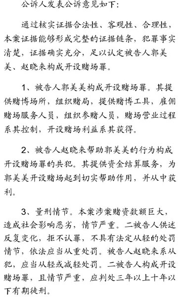公訴人發表公訴意見,認為被告人郭美美、趙曉來構成開設賭場罪,且情節嚴重,應判處三年以上十年以下有期徒刑。