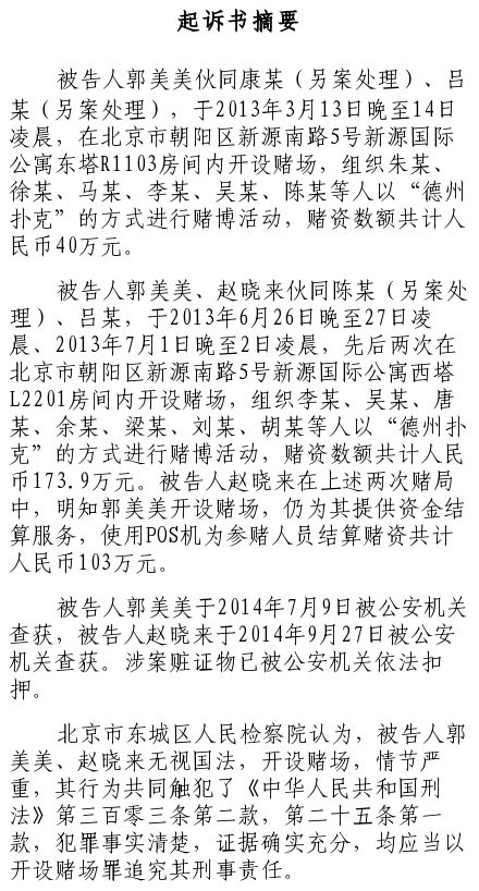 本案“起訴書摘要”曝光,據起訴書,郭美美開設賭場兩夜,賭資數額173.9萬。