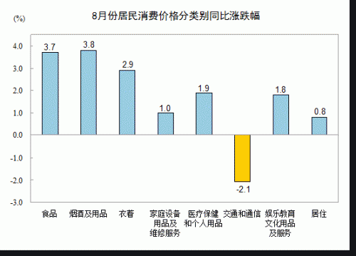8月份,非食品價格同比上漲1.1%。其中,煙酒及用品、衣著、醫療保健和個人用品、娛樂教育文化用品及服務、家庭設備用品及維修服務、居住價格分別上漲3.8%、2.9%、1.9%、1.8%、1.0%和0.8%;交通和通信價格下降2.1%。