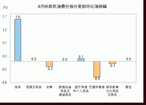 8月份,全國居民消費價格總水平環比上漲0.5%。其中,城市上漲0.4%,農村上漲0.6%;食品價格上漲1.6%,非食品價格下降0.1%;消費品價格上漲0.7%,服務價格上漲0.1%。