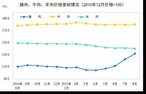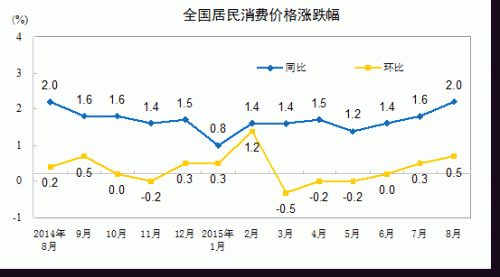 2015年8月份,全國居民消費價格總水平同比上漲2.0%。其中,城市上漲2.0%,農村上漲1.8%;食品價格上漲3.7%,非食品價格上漲1.1%;消費品價格上漲1.8%,服務價格上漲2.2%。1-8月平均,全國居民消費價格總水平比去年同期上漲1.4%。