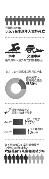 每年約有5.5萬名未成年人意外死亡;未成年人吸毒人數逐年增多。昨天提請全國人大常委會審議的全國人大常委會執法檢查組關于檢查《中華人民共和國未成年人保護法》實施情況的報告,披露了我國近3億未成年人人身安全面臨的問題,建議適時研究制定兒童福利法。