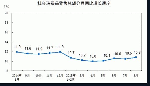 國家統計局今日公布數據顯示,2015年8月份,社會消費品零售總額24893億元,同比名義增長10.8%(扣除價格因素實際增長10.4%,以下除特殊說明外均為名義增長)。其中,限額以上單位消費品零售額11257億元,增長8.0%。