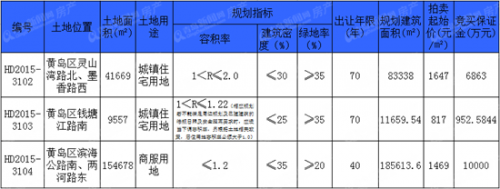 另一幅住宅地塊——HD2015-3103號地塊位于黃島區錢塘江路南,占地面積9557㎡,規劃建筑面積11659.54㎡,容積率不大于1.22。關于容積率,公告中特別提到:相應規劃若不能滿足周邊規劃及已建建筑的法規日照及安全距離要求時,應適當下調容積率,另根據土地相關政策,居住用地容積率必須大于1.0。該地塊拍賣起始價為817元/㎡,競買保證金952.5844萬元。