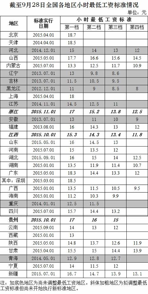 截至9月28日全國各地區小時最低工資標準情況。(注:天津實行日期應為2015年4月1日) 人社部網站