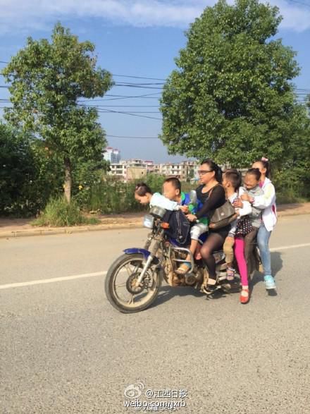 女子騎著二輪摩托車載著一家老小共7人行駛在路上