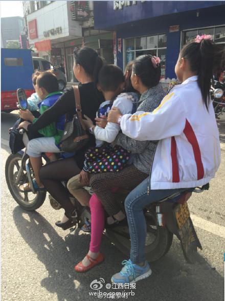 9月27日,網友在都昌縣大轉盤四小路段見到驚險一幕。一女子騎著二輪摩托車載著一家老小共7人行駛在路上。只見其摩托車油箱上趴著2個孩子,后座擠著3個小孩一個老人,坐在車最后面的小女生僅有半個屁股落在貨物架上,看著讓人擔心。