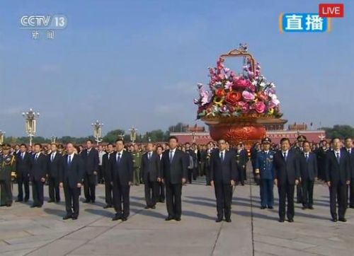 當天臨近10時,習近平、李克強、張德江、俞正聲、劉云山、王岐山、張高麗等黨和國家領導人就已來到天安門廣場人民英雄紀念碑前,靜靜肅立,出席10時正式開始的向人民英雄敬獻花籃儀式。