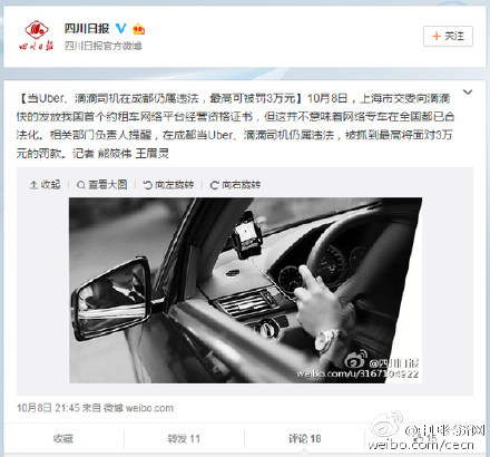 【成都:Uber、滴滴專車仍屬違法 抓到最高罰3萬】《四川日報》官方微博稱:“10月8日,上海市交委向滴滴快的發(fā)放我國首個約租車網絡平臺經營資格證書,但這并不意味著網絡專車在全國都已合法。相關部門負責人提醒,在成都當Uber、滴滴司機仍屬非法,被抓到最高將面對3萬元的罰款。”