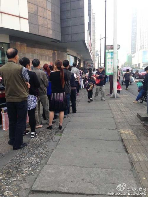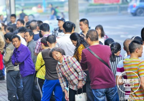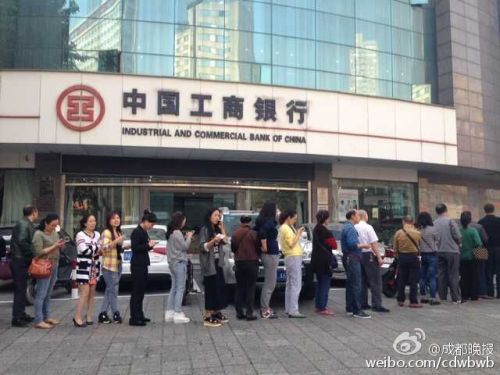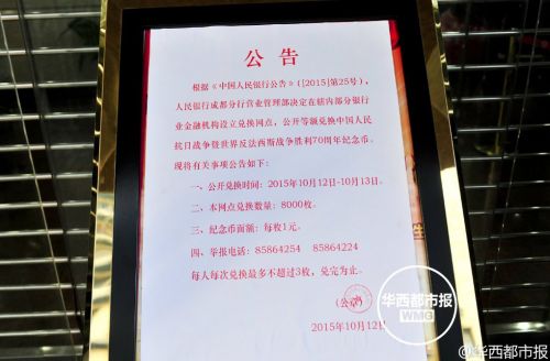 12日上午9點30分,“中國人民抗日戰爭暨世界反法西斯戰爭勝利70周年”紀念幣在成都各大銀行兌換網點開始兌換,該幣面值一元,等價兌換。鼓樓南街招商銀行,市民已排起長隊。早不到8點,吳女士帶著小板凳在門口等著了,搶到第二位。