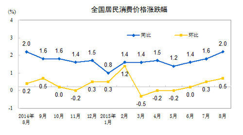 今年1-8月份,全國CPI分別同比上漲0.8%、1.4%、1.4%、1.5%、1.2%、1.4%、1.6%、2%。對于即將公布的9月份CPI,機構普遍預測,由于豬肉和蔬菜價格出現回落,9月CPI同比漲幅或將回落到1.8%左右。