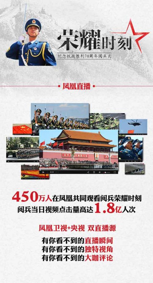 在剛剛結(jié)束的9•3閱兵報(bào)道中,鳳凰網(wǎng)也是堅(jiān)守了自身一貫善于時(shí)政、軍事題材的優(yōu)勢(shì)。大閱兵看鳳凰,不只是一句口號(hào),9•3勝利日當(dāng)天,1.4億人看鳳凰,9000多萬(wàn)網(wǎng)民在鳳凰移動(dòng)端關(guān)注閱兵,日增86%,450萬(wàn)人在鳳凰共同觀看閱兵榮耀時(shí)刻,視頻點(diǎn)擊量高達(dá)1.8億人次。通過(guò)與央視雙平臺(tái)合作,鳳凰為觀眾提供了更具權(quán)威性的視角與大咖評(píng)論。