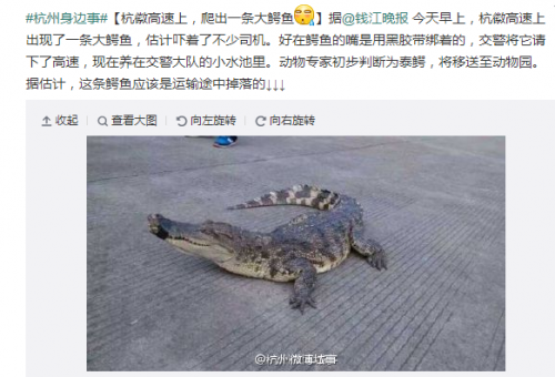 早上,杭徽高速上,就出現(xiàn)了一條活生生的大鱷魚,估計嚇著了不少過路司機。好在,這條鱷魚的嘴是用黑膠帶綁著的,高速交警將它請下了高速,現(xiàn)在養(yǎng)在交警大隊的小水池里。