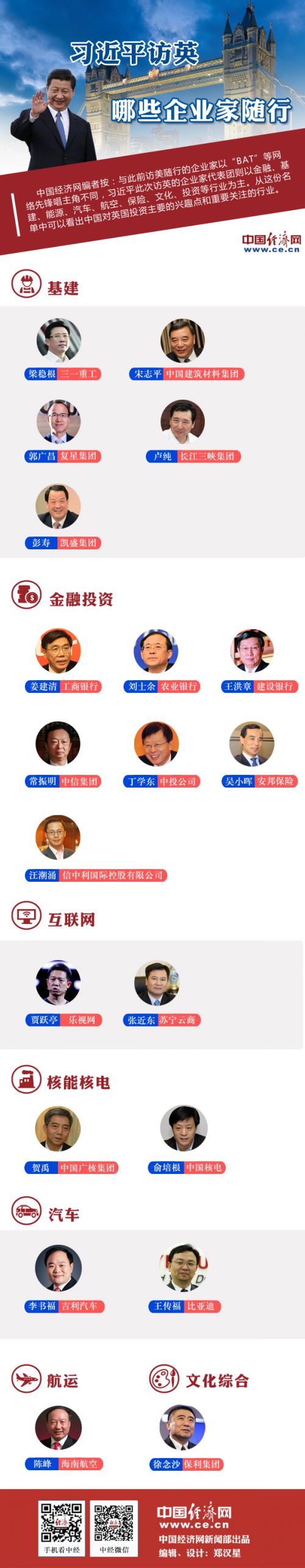 中國經濟網編者按:與此前訪美隨行的企業家以“BAT”等網絡先鋒唱主角不同,習近平此次訪英的企業家代表團則以金融、基建、能源、汽車、航空、保險、文化、投資等行業為主。從這份名單中可以看出中國對英國投資主要的興趣點和重要關注的行業。