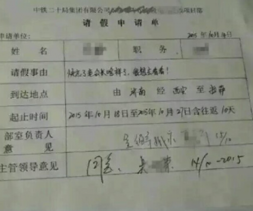從假條來看,共請了10天假,要從濟南途徑西安去拉薩看望他的丈夫。從假條的抬頭“中鐵20局集團有限公司”來看,這應該是一對長期分在兩個項目的一線工地夫妻……這樣的理由,怎么忍心拒絕呢?.為了大家犧牲小家,必須為各位格子衫軍點贊!