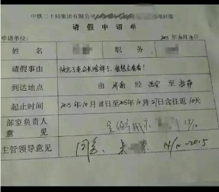 記者在曬出的請(qǐng)假申請(qǐng)單上看到,在這張10月14日的假條上,請(qǐng)假事由一欄寫(xiě)著:“快忘了老公長(zhǎng)啥樣了,我想去看看!”地點(diǎn)為由濟(jì)南經(jīng)西安至拉薩,含往返共10天。