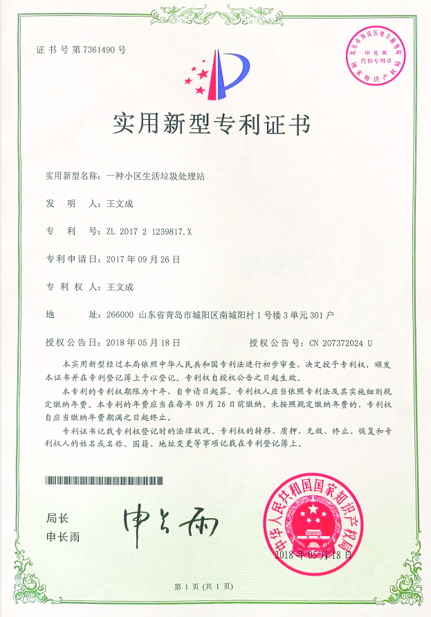 慢慢地他有了一些想法,善于總結的他借助十多年積累的經驗和干一行、愛一行、鉆研一行的勁頭,經過無數次設計、推倒、再設計、再完善的過程,設計制造出利用微生物活性,完全無害化處理果蔬垃圾和廚余垃圾的專用系統,并于2017年9月26日獲得國家實用新型專利。