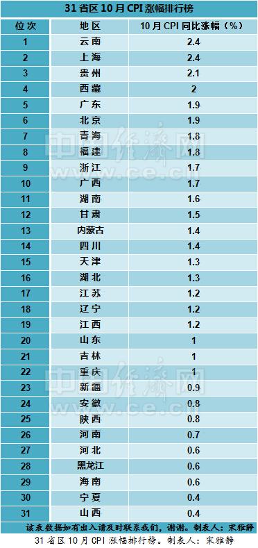 在中國經濟網記者制作的10月份31省區CPI同比漲幅排行榜中可以看到,云南、上海、貴州居前三位,其中云南、上海CPI同比漲2.4%并列全國第一,,貴州同比漲2.1%次之。,此外山西同比上漲0.4%處在全國最末位。值得注意的是,青海自2014年8月至今年9月份,已連續14個月物價漲幅為全國第一,在10月終于打破了獨霸第一的局面,此番降至全國第七。
