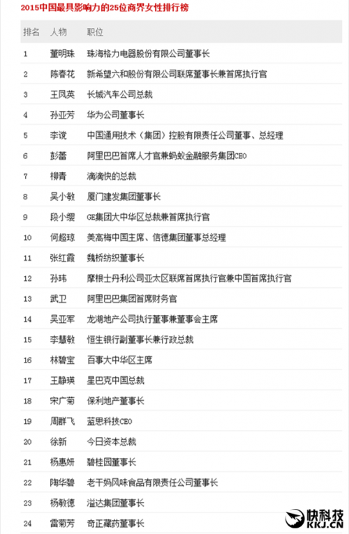 華為公司董事長孫亞芳位列第4,阿里巴巴首席人才官兼螞蟻金融服務集團CEO彭蕾排名第6,滴滴快的總裁柳青則拿到了第7。