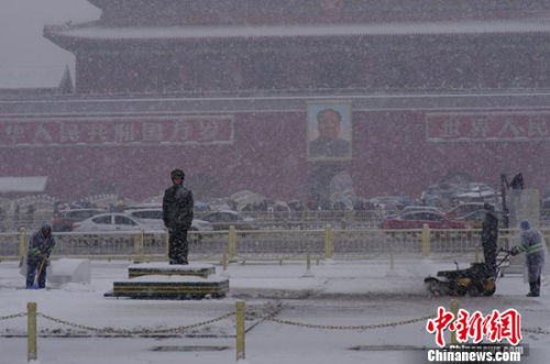 11月22日,北京在周日迎來了第二場降雪。圖為天安門廣場上武警戰士在雪中紋絲不動堅守崗位。