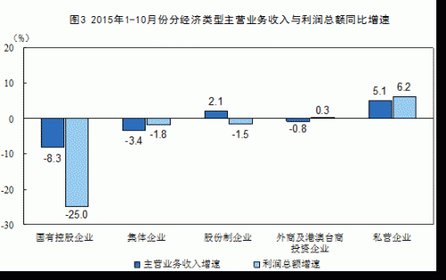 規(guī)模以上工業(yè)企業(yè)中,1-10月份國有控股企業(yè)實(shí)現(xiàn)利潤總額9080.6億元,同比下降25%;集體企業(yè)實(shí)現(xiàn)利潤總額395.3億元,下降1.8%;股份制企業(yè)實(shí)現(xiàn)利潤總額32698.7億元,下降1.5%;外商及港澳臺商投資企業(yè)實(shí)現(xiàn)利潤總額12082.9億元,增長0.3%;私營企業(yè)實(shí)現(xiàn)利潤總額17511億元,增長6.2%。