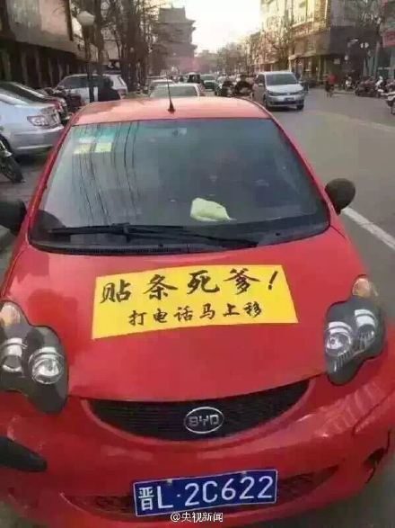 山西最囂張違章停車司機車頭貼標語:貼條死爹 2015-11-28 08:39 0 “最牛”違停司機 “最牛”違停司機 【“最牛”違停司機: 貼條死爹】 “貼條死爹,打電話馬上移”。日前,山西臨汾一違法停車司機為防被貼罰單,在車頭貼上這樣的標語。有網友建議,首次違法停車時交警可以電話警告勸離;也有 人說違法停車還如此“囂張”實在不文明。城市停車越來越難的今天,你怎么看?(央視記者崔肖冉)