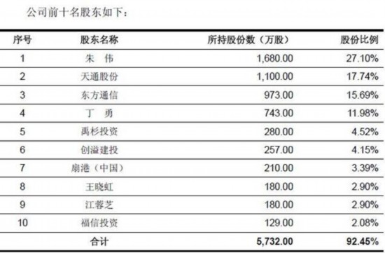 A股上市公司天通股份和東方通信(600776)分別持有博創(chuàng)科技發(fā)行前1100萬股和973萬股,占股本比例為17.74%、15.69%,為第二、第三大股東。