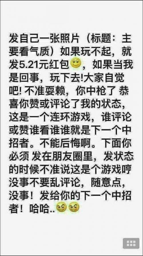 這兩天,不少玩微信朋友圈的人被“主要看氣質(zhì)”的接龍游戲所影響,參與該游戲方式有兩種,要么接龍發(fā)自己照片繼續(xù)游戲,要么向讓你中招的微信好友發(fā)一個(gè)5.21元的紅包。