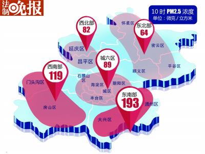 值得一提的是,今天上午京城南部達(dá)到了中度到重度污染程度,其中東南部最重,為193微克/立方米;西南部為119微克/立方米。
