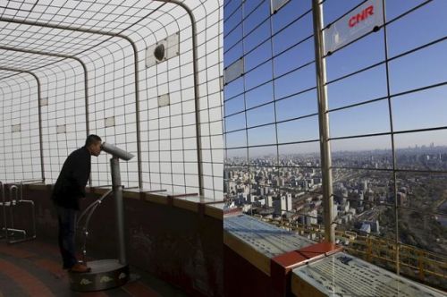 2015年6月22日,在被霧霾籠罩的智利首都圣地亞哥,人們站在市郊圣克里斯托瓦爾山山頂上拍照。(新華社/美聯(lián))