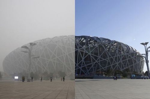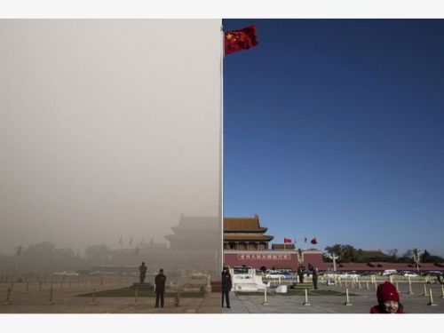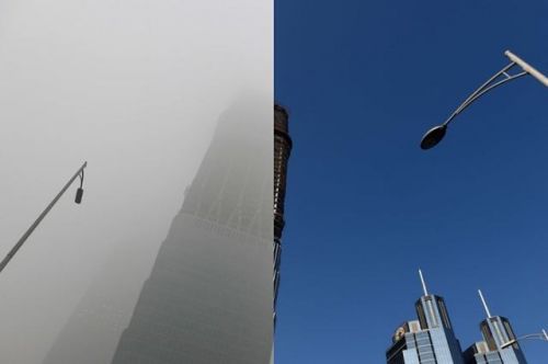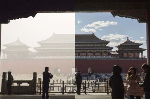 英國(guó)《衛(wèi)報(bào)》網(wǎng)站8日刊登一組拼版照片,選取北京城多處標(biāo)志性地點(diǎn),反映在紅色預(yù)警發(fā)布前后北京的不同“氣質(zhì)”。
