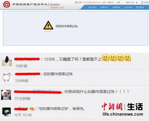 中新網生活頻道采訪發現,不僅是陳女士,多名急著購票的網友都遇到了同樣的情況。網友“一個人的西游記”吐槽:“您的操作頻率過快,被誤傷。”網友“秋千蕩悠悠”則發出疑問:“12306又癱瘓了嗎?登都登不上。”