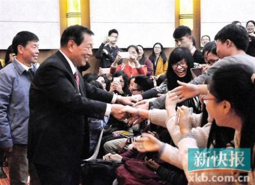 昨日下午3時許,一身西裝革履的李昌鈺來到了廣東財經大學綜合樓408室。剛出現在大門口,等候多時的師生們就立馬簇擁了上去,爭先恐后握手和拍照。