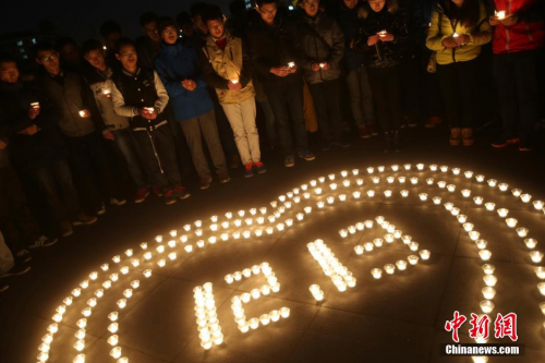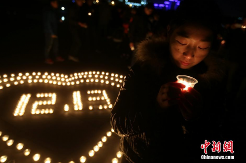 12月12日,在第二個國家公祭日前夜,主題為“牢記歷史,勿忘國恥,凝聚力量,圓夢中華”的燭光祭活動在南京東南大學九龍湖校區(qū)內舉行,來自該校機械工程學院和人文學院的大學生們點燃蠟燭,擺放成心形和1213字樣,為南京大屠殺死難者集體默哀,寄托哀思。 泱波 攝