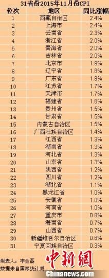 31省份11月份CPI漲幅。