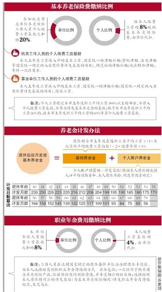 除規定繳納養老保險外,《辦法》還提出,機關事業單位應為其工作人員建立職業年金。職業年金所需費用由單位和個人共同承擔。單位繳納職業年金費用的比例為本單位參保人員繳費工資基數之和的8%;個人繳費比例為本人繳費工資基數的4%,由單位代扣。