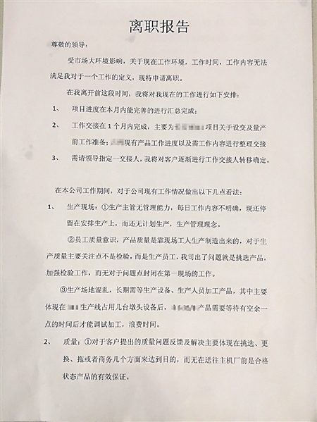 記者看到,除了寫明離職理由、工作交接,離職信的大部分內容都與工作情況有關,涉及生產場地、技術、福利等五大項,對每項存在的問題都給出了建議,如“進一步培訓檢驗人員”、“將生產會與質量會一起召開”、“根據實際分配人員”等,分別提到了質量意識、技術服務、增加福利等,記者數了數,一共有14個方面的內容。