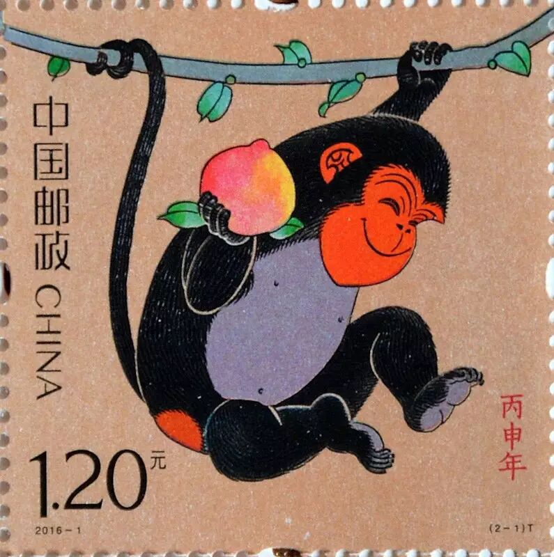 此次發(fā)行的猴年郵票為一套兩枚。第一枚“靈猴獻(xiàn)瑞”采用了金色、黑色和紅色三種色彩表現(xiàn)。畫中,公猴子的一只手抓在樹枝上,尾巴纏在桃樹上,另一只手捧著桃子,意寓“捧桃獻(xiàn)瑞”的概念。