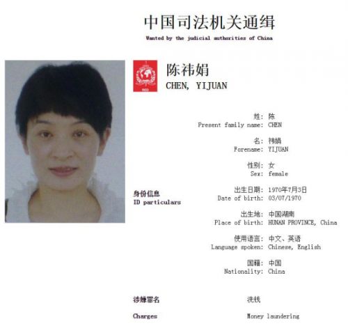 陳祎娟,女,1970年出生,中共黨員,曾任中國(guó)移動(dòng)通信集團(tuán)終端公司湖南分公司綜合部員工,涉嫌洗錢(qián)犯罪,2013年4月逃往英國(guó),國(guó)際刑警組織紅色通緝令號(hào)碼A-7810∕12-2013。