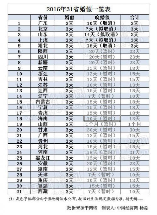 2015年31省市婚假一覽表。制表人:楊淼