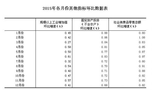 (3)根據季節調整模型自動修正結果,對近一年來各期國內生產總值、規模以上工業增加值、固定資產投資(不含農戶)、社會消費品零售總額環比增速進行修訂。修訂結果及2015年四季度GDP環比數據、2015年12月份其他指標環比數據如下: