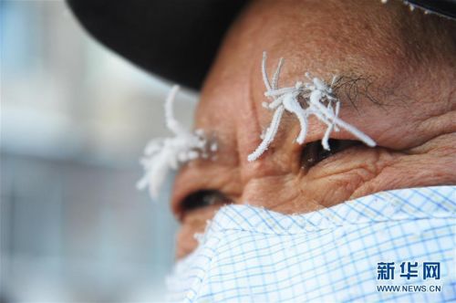 1月21日在哈爾濱街頭拍攝的一名帽子上掛滿冰霜的路人。