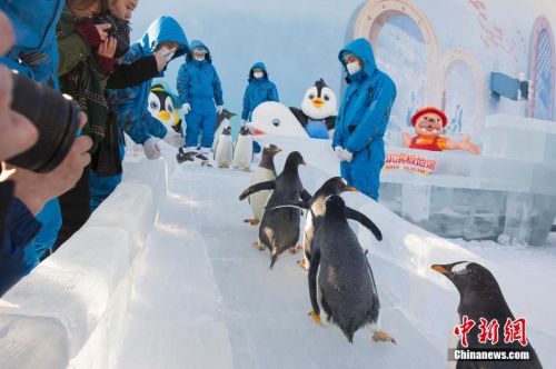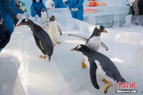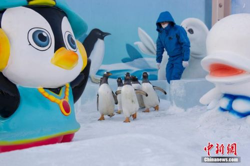 1月20日,哈爾濱出現極寒天氣,哈爾濱極地館內生活的8只南極企鵝走出戶外。
