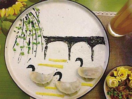 制作過程:用黑芝麻和綠色果醬畫出柳樹和大橋以及鴨頭,再擺上肉餃當鴨身。