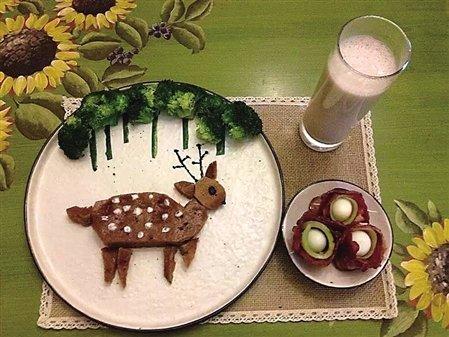 制作過程:用剪刀把紅糖發糕剪成小鹿的形狀,用芝麻醬畫上眼睛、鼻尖和角,擺上西蘭花,用沙拉醬點上鹿的斑點。