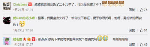 @西安公安 昨天發了這條微博之后,一大波單身狗襲來:蜀黍我男朋友丟了二十幾年了,可以報失蹤了不?